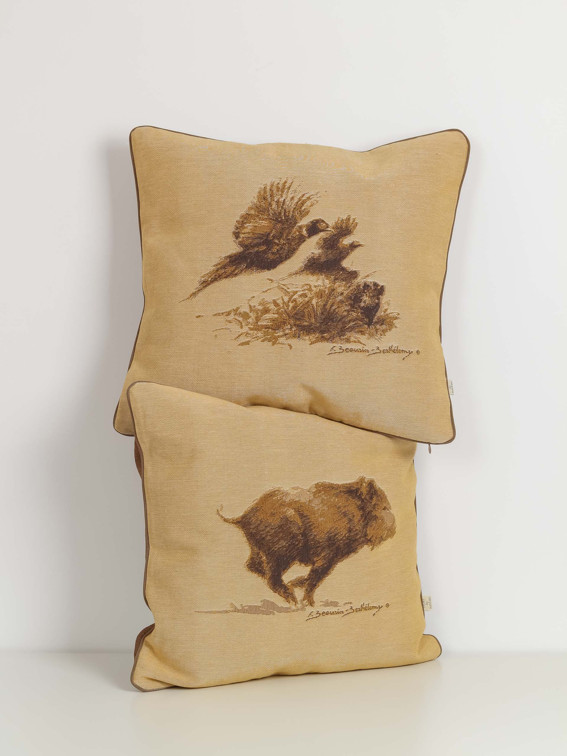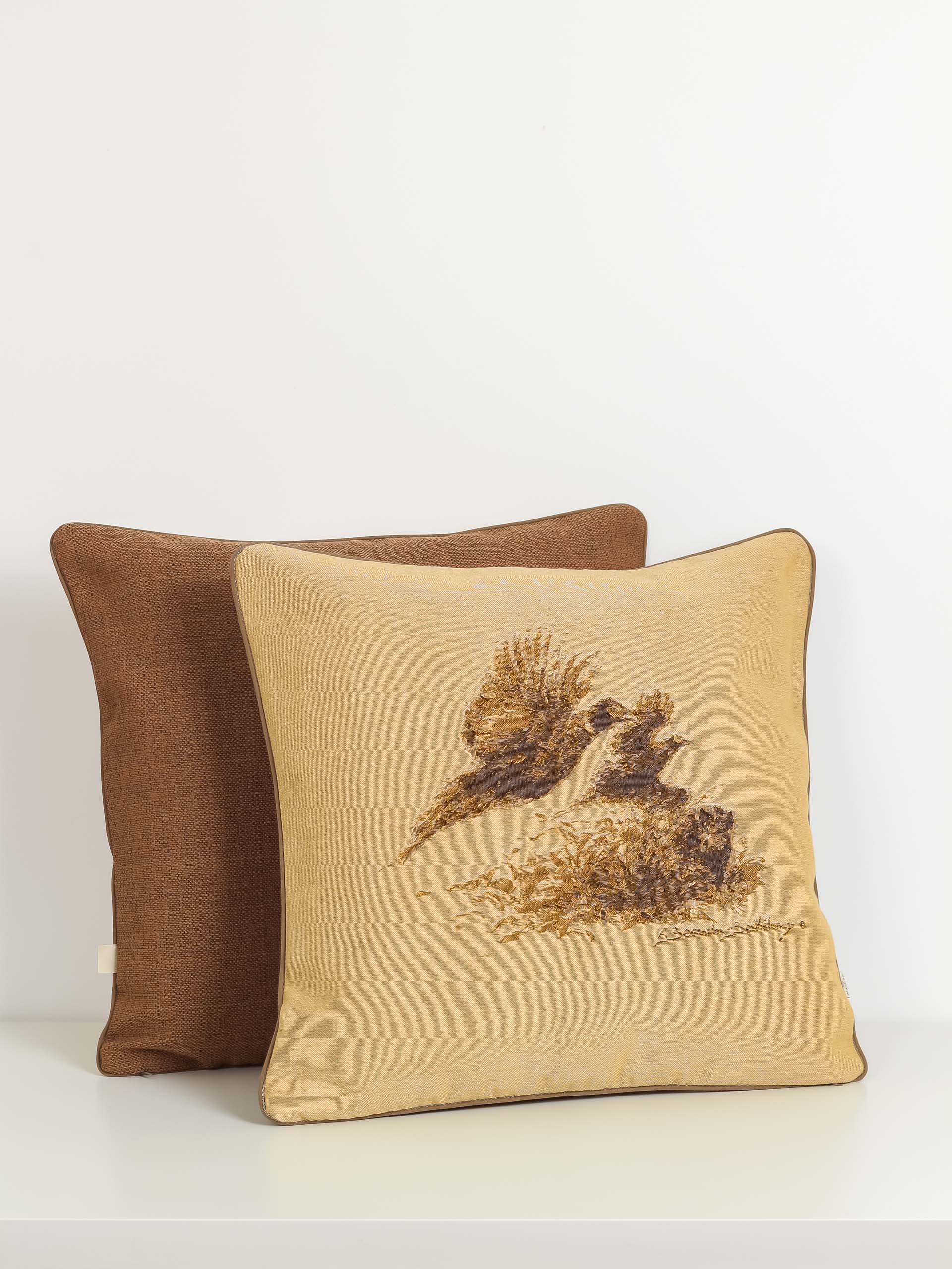 Kai fazanas pakyla, visas miškas trumpam sustoja: trapus sparnų tvinksnis supurto tylą, o ore pasklinda žemės ir rudens kvapas. Šiame belgiško gobeleno užvalkale užfiksuota būtent ta akimirka — plasnojanti laisvė, judesys ir laukinės gamtos elegancija.