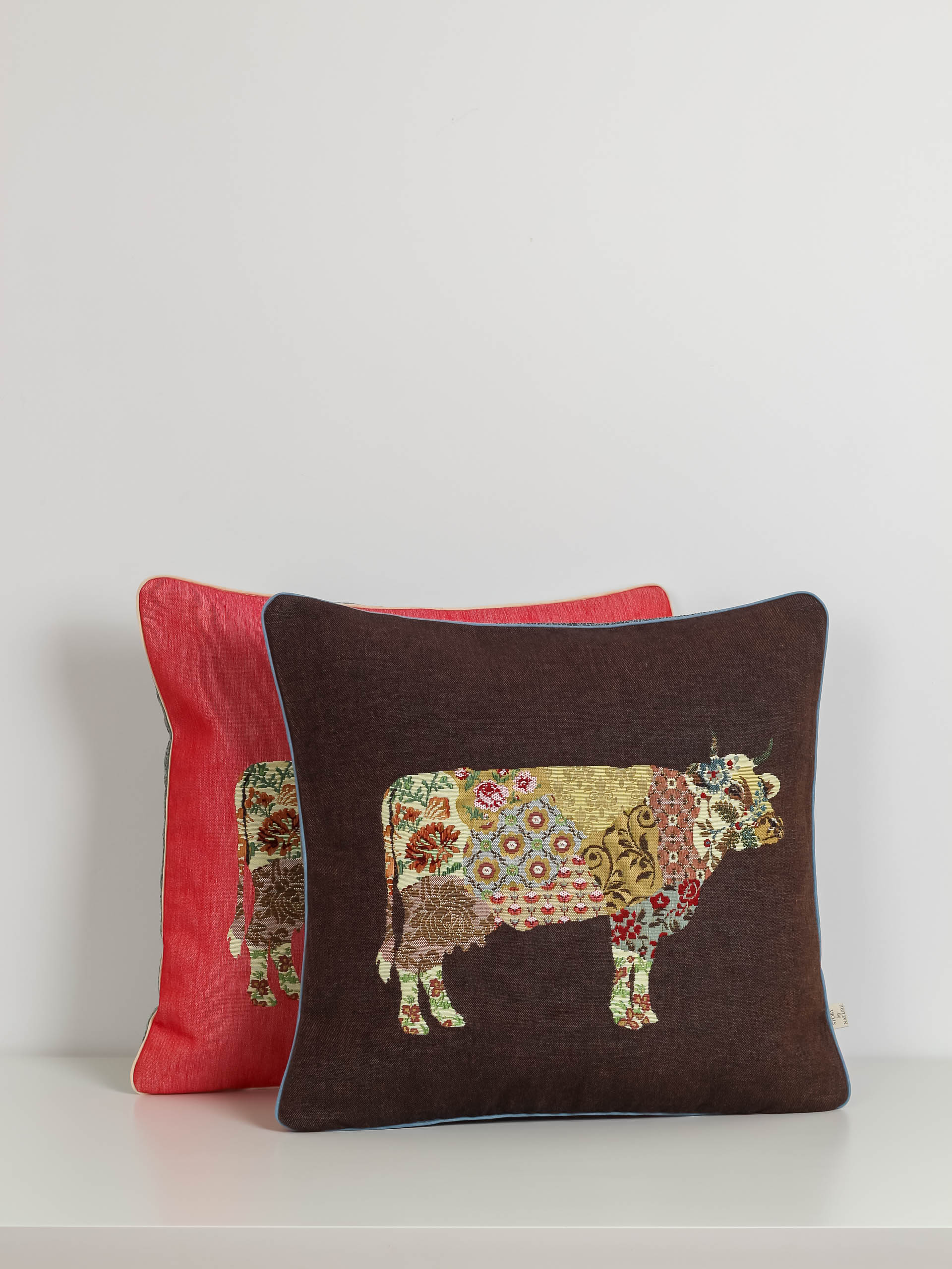Ši dekoratyvinė pagalvėlė – tikras meno ir jaukumo derinys. Tamsiai rudo gobeleno fone išryškėja karvės siluetas, sudėliotas iš spalvingų gėlėtų ir ornamentuotų raštų. Šis unikalus dizainas primena lopinėlį po lopinėlio...