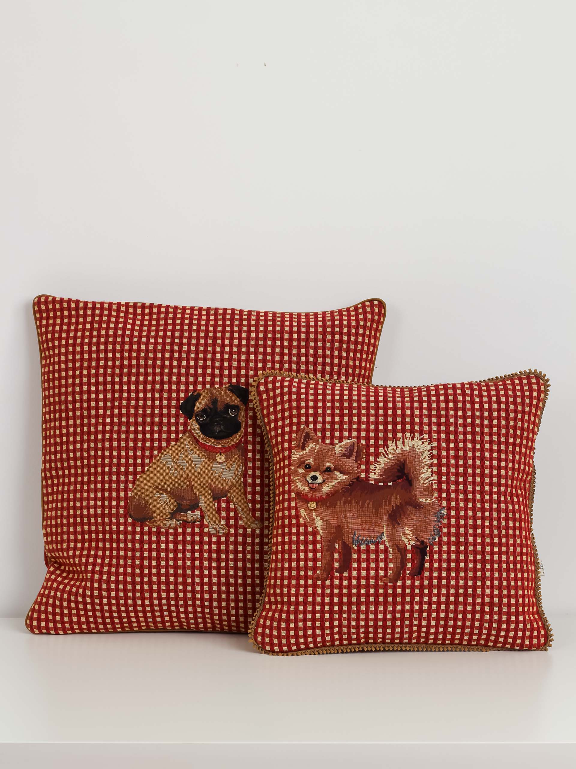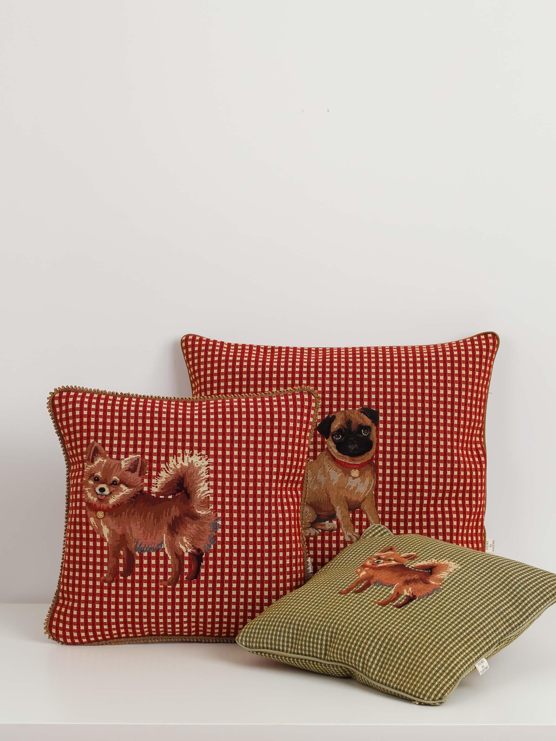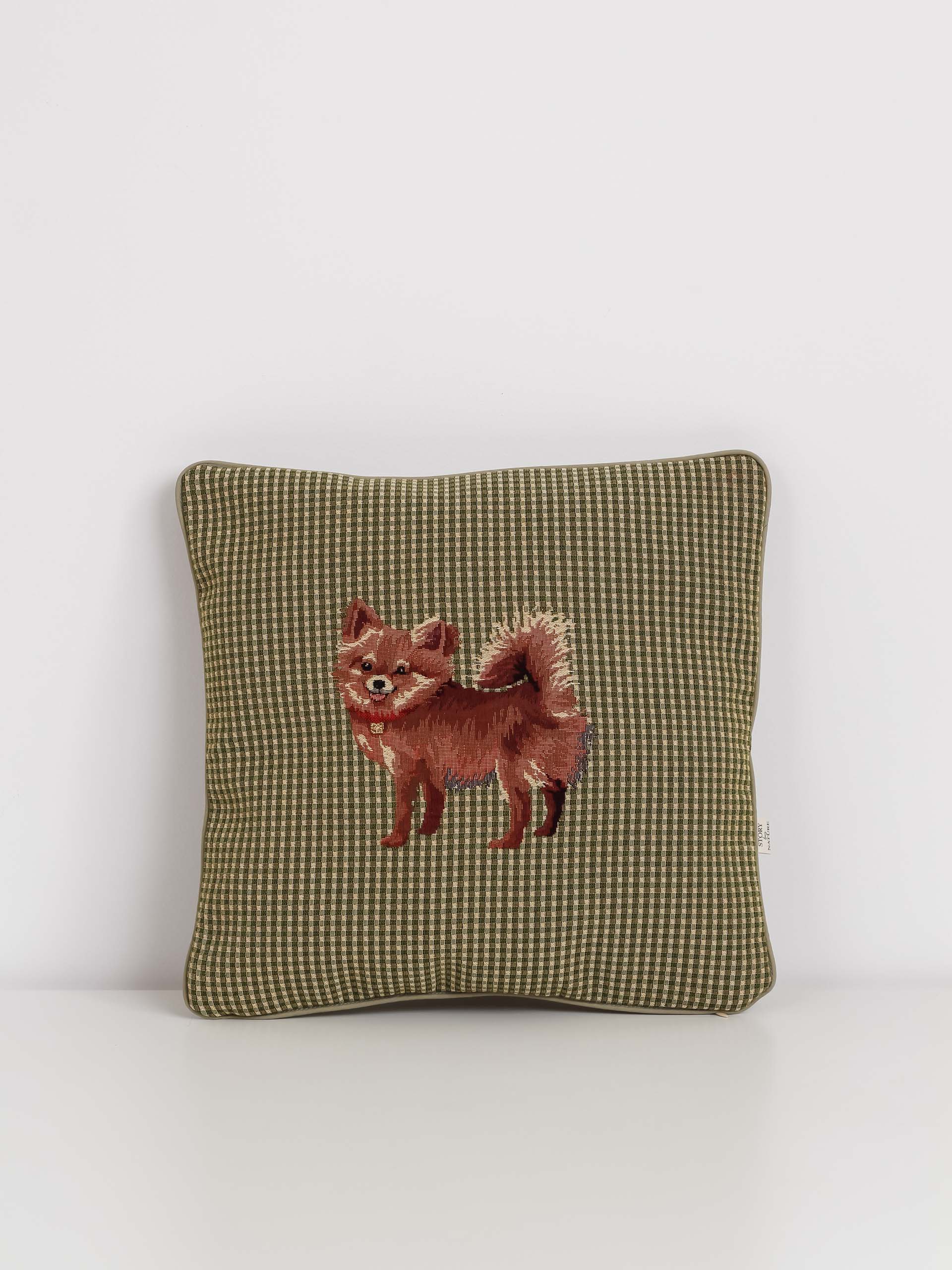 Šis dekoratyvinės pagalvėlės užvalkalas su pomeranijos špicu – tobulas pasirinkimas tiems, kurie myli šunis ir vertina išskirtinį, rankų darbo dizainą. Žalias languotas fonas pabrėžia šuns žaismingą išraišką, o kruopščiai išaustas atvaizdas perteikia šios veislės charakteringą žavesį.