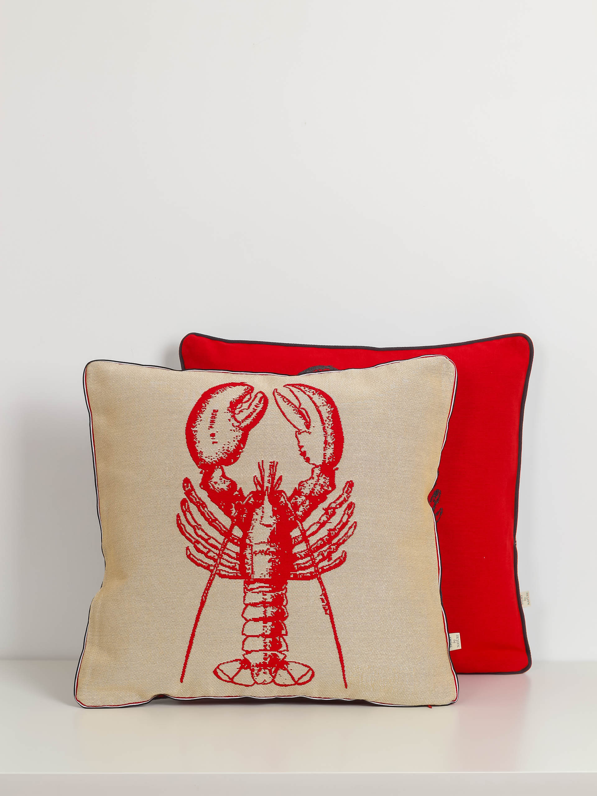 Šis pagalvėlės užvalkalas primena pajūrio dieną, kai smėlis dar šiltas nuo saulės, o horizonte mirga ryškūs, vasariški akcentai. Ant šampaninio, švelniai tekstūruoto fono iškilęs raudonas omaras atrodo tarsi iliustracija iš senovinio jūrų atlaso – kontrastingas, išraiškingas ir kupinas charakterio.
