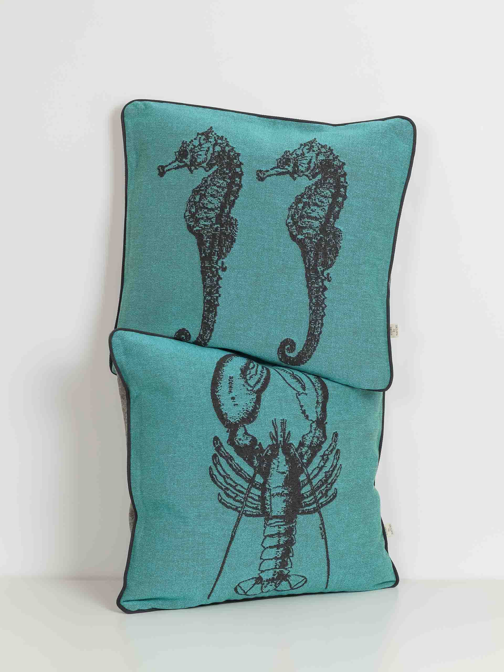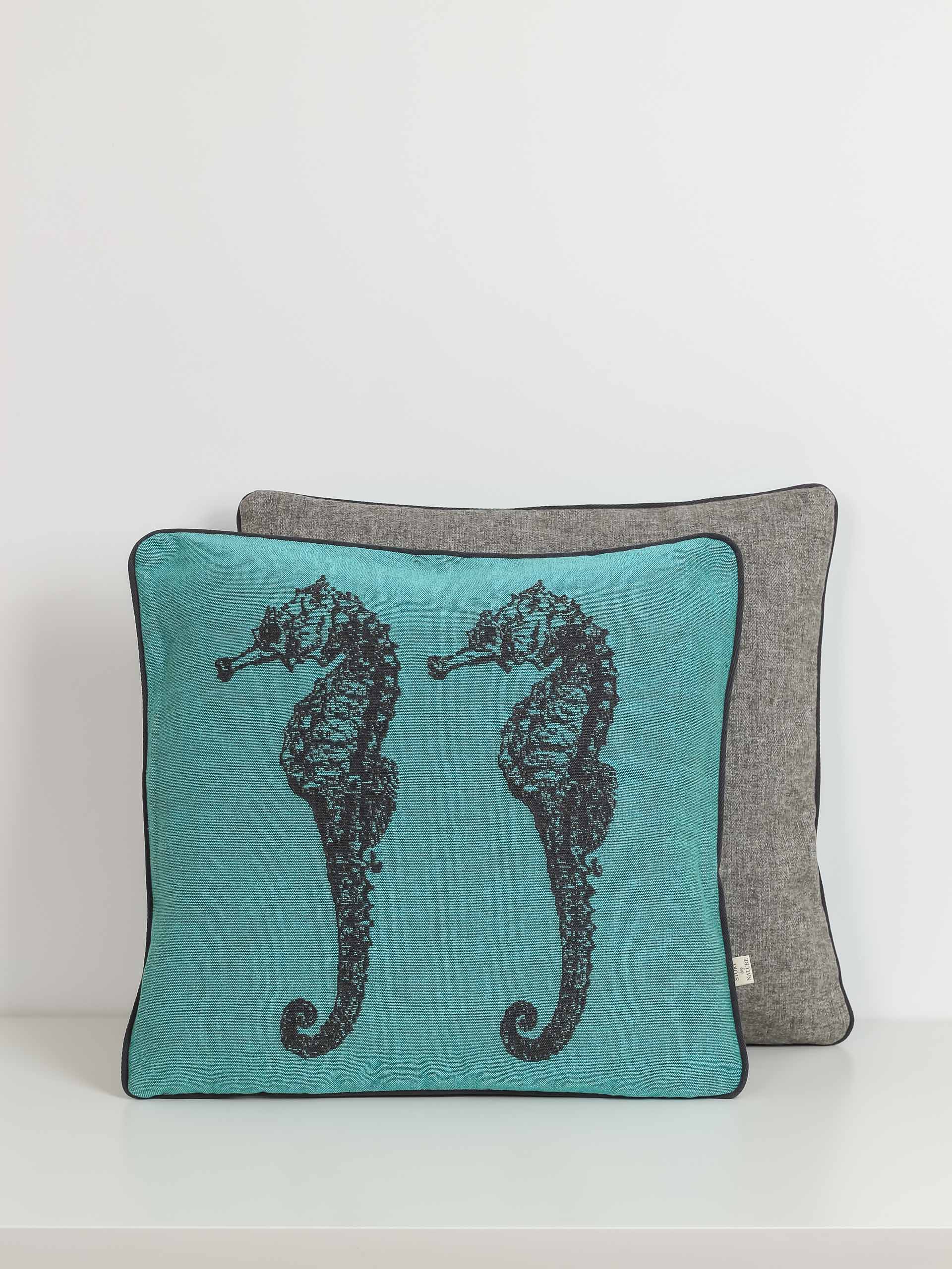 Šis pagalvėlės užvalkalas — tarsi langas į tylų povandeninį pasaulį. Du juodi grafiški jūrų arkliukai subtiliai išsiskiria turkio fone, primenančiame žydrai skaidrią jūros gelmę. Jų elegantiškos formos, vingiuotos uodegos ir lengvas siluetas kuria raminančią, harmoningą nuotaiką.