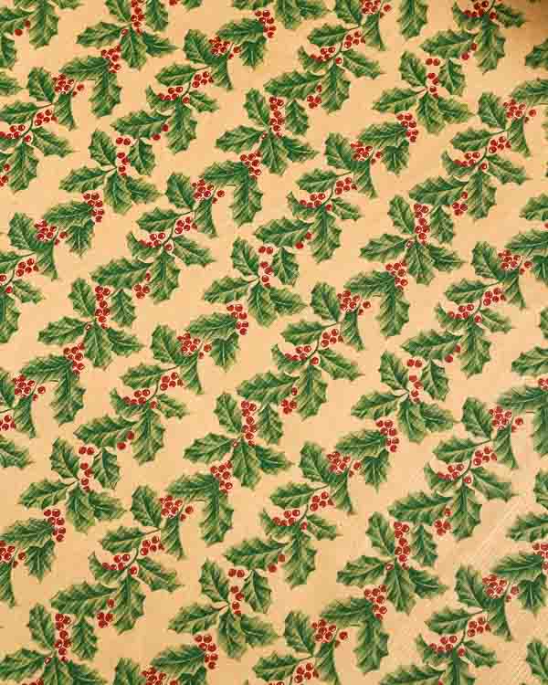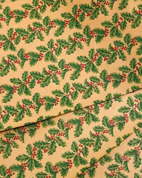 Šventiškas dovanų pakavimo popierius, dekoruotas tradiciniais bugienio (holly) lapais ir ryškiai raudonomis uogomis. Tai vienas atpažįstamiausių Kalėdų simbolių, suteikiantis dovanoms tikrą, klasikine tradicija alsuojančią šventinę nuotaiką.
